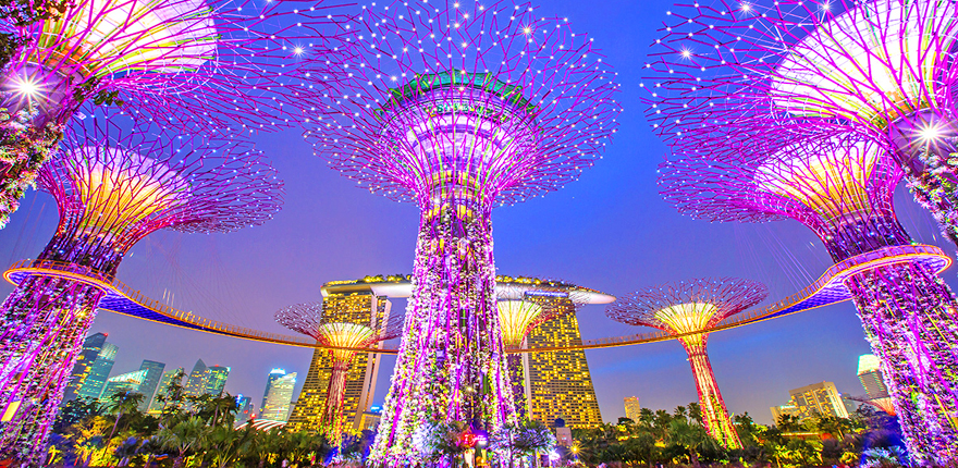 - Kỳ quan Gardens by the Bay (Những khu vườn bên Vịnh) đây là khu vườn nhân tạo rộng hơn 100ha, có hơn 250.000 loài thực vật quý hiếm, với các Siêu cây khổng lồ lấy năng lượng mặt trời vào ban ngày và tỏa sáng vào ban đêm. Từ đây Quý khách có thể chụp hình toàn cảnh “Chiếc du thuyền” nằm ở độ cao 200m trên đỉnh của ba tòa nhà khách sạn Marina Bay Sands.