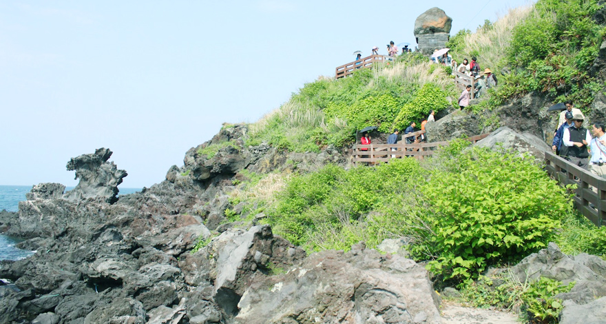 * Bãi cột đá Jusangjeolli - một kiệt tác thiên nhiên, được hình thành từ dung nham núi lửa Hallasan chảy xuống bãi biển Jungmun.