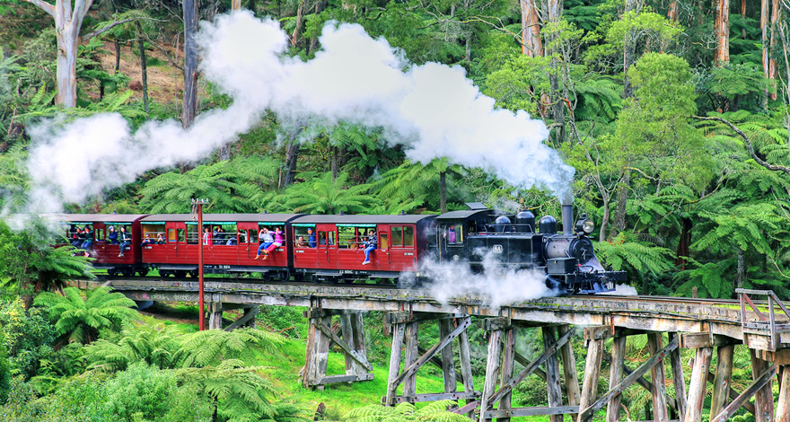 - Tiếp tục trải nghiệm trên chuyến tàu lửa hơi nước Puffing Billy cổ được ra đời từ năm 1900 lúc 10:45 (lưu ý không đến trễ giờ tàu). Tàu đưa quý khách xuyên qua cách rừng nguyên sinh với những cảnh đẹp thiên nhiên hùng vĩ, rộng lớn và tươi đẹp, mang lại sự trải nghiệm thư thái và thú vị cho quý khách.
